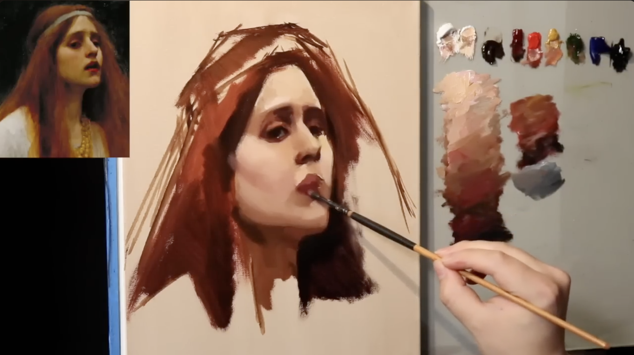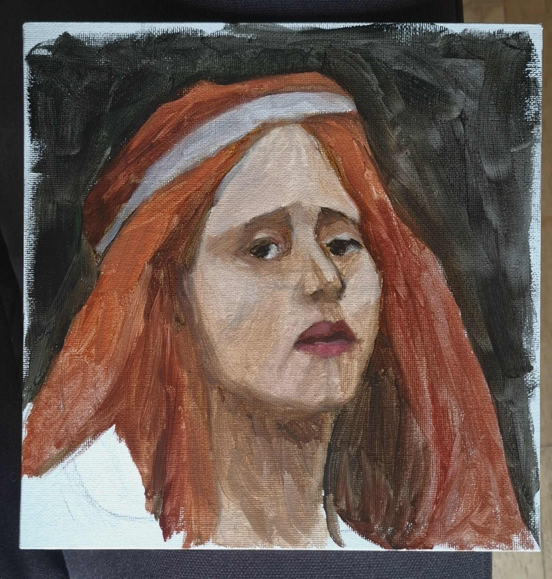 Ik heb zelf alleen nog maar met waterverf en vooral acrylverf geschilderd, dus ik ga nu oefenen met olieverf om te kijken hoe dit gaat, en of dit een optie is om ook echt voor mijn eindopdracht te doen. Dat doe ik aan de hand van een video. Deze laat een master studie zien van een ingezoomd portret in 'The Lady of Shalott' van Waterhouse.